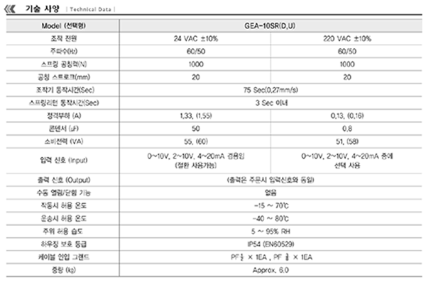 GEA-10SR(I) Spring Return Electric Linear Valve Actuator´Â Àü·Â °ø±Þ¿¡ ÀÌ»óÀÌ »ý±â°Å³ª Á¤ÀüÀÌ µÈ °æ ¿ì¿¡ ¹ëºê Á¶À۱⳻¿¡ ³»ÀåµÇ¾î ÀÖ´Â ½ºÇÁ¸µ¿¡ ÀÇÇØ ÀÚµ¿ÀûÀ¸·Î µ¿ÀÛÇÏ¿© ¹ëºê¸¦ Close½ÃŰ´Â ±â´ÉÀ» °¡Áö°í ÀÖ°í 2°¡Áö ŸÀÔÀÌ ÀÖ´Ù. Æò»ó½Ã´Â ½Ã±×³Î¿¡ ÀÇÇØ ºñ·Ê·Î µ¿ÀÛÇÑ´Ù. ¶ÇÇÑ MotorÀÇ È¸Àü·ÂÀ» ÀûÀýÇÑ °¨¼Ó±â¾î ¹× µ¿·ÂÀü´Þ ÀåÄ¡¿¡ ÀÇÇÏ¿© ÀûÀýÇÑ Force ¹× Speed¸¦ ¹ß»ý½Ãų ¼ö ÀÖ´Â ¿ì¼öÇÑ Actuator·Î¼, GEA´Â Linear Type Àü¿ëÀ¸·Î Globe Control Valve¿¡ Àû¿ë½Ãų ¼ö ÀÖÀ¸¸ç ´Ù¾çÇÑ ±â´É°ú °ß°íÇÑ ±¸Á¶(Robust Design), È®½ÇÇÑ ÀÛµ¿(Reliable Operating), À¯Áö º¸¼ö°¡ °ÅÀÇ ÇÊ¿äÄ¡ ¾ÊÀ¸¸ç ½ºÆÀ, °¡½À½Ã¼³ ¹× °øÁ¶ ½Ã½ºÅÛ¿¡ Àû¿ëµË´Ï´Ù.