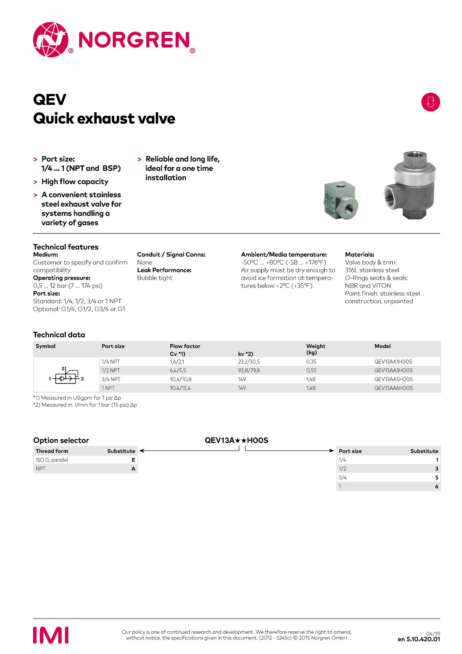 QEV Quick exhaus valve(SUS316L), IMI NORGREN / MAXSEAL